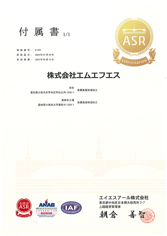 ①当社の事業活動である金属表面処理の、加工における品質、環境への影響を的確にとらえ、特に下記項目について品質、環境目的・目標を定め、定期的に見直しすることにより、継続的改善と品質維持と汚染の予防に努める。